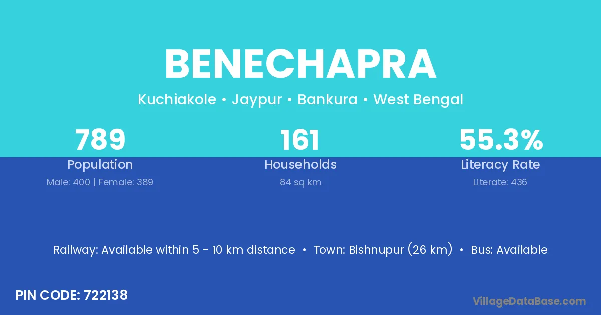 Bishnupur (26 km) is the nearest town to Benechapra village for major economic activities and is located approximately 26 km away.