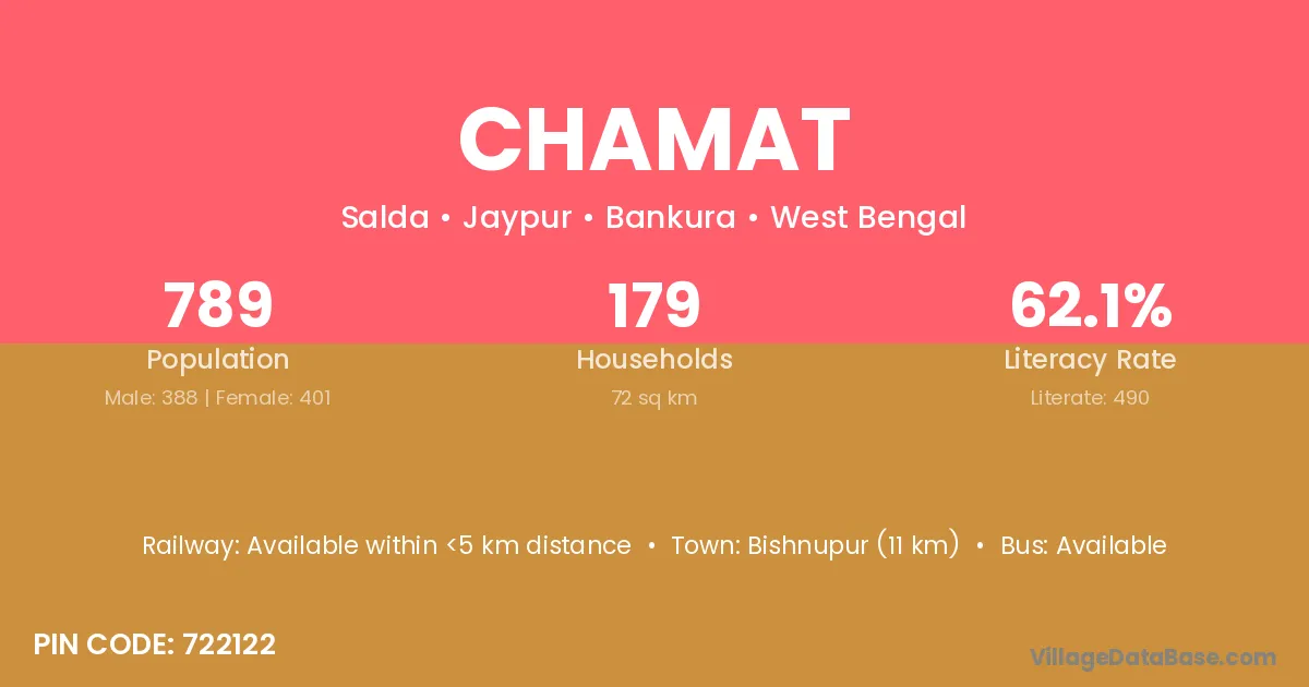 Bishnupur (11 km) is the nearest town to Chamat village for major economic activities and is located approximately 11 km away.