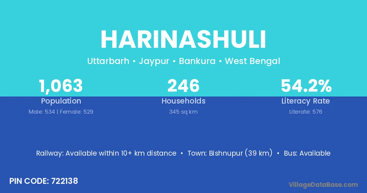 Bishnupur (39 km) is the nearest town to Harinashuli village for major economic activities and is located approximately 39 km away.