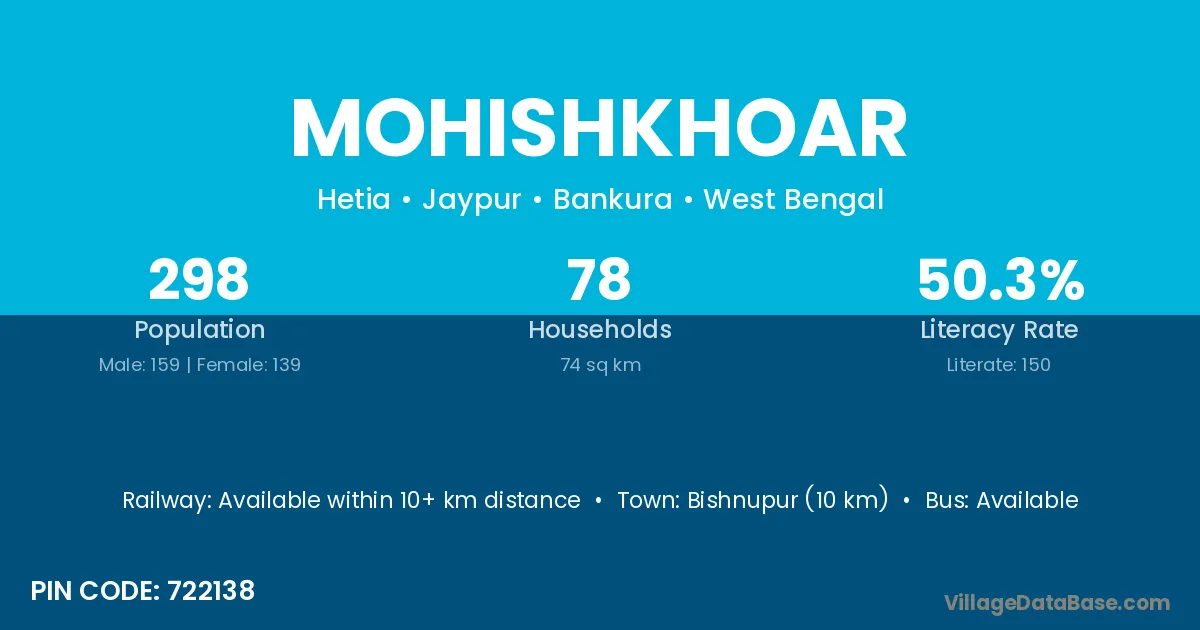 Bishnupur (10 km) is the nearest town to Mohishkhoar village for major economic activities and is located approximately 10 km away.