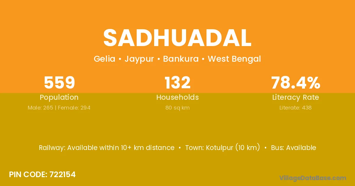 Kotulpur (10 km) is the nearest town to Sadhuadal village for major economic activities and is located approximately 10 km away.