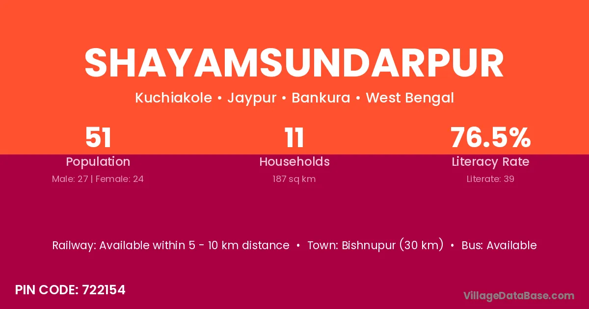 Bishnupur (30 km) is the nearest town to Shayamsundarpur village for major economic activities and is located approximately 30 km away.