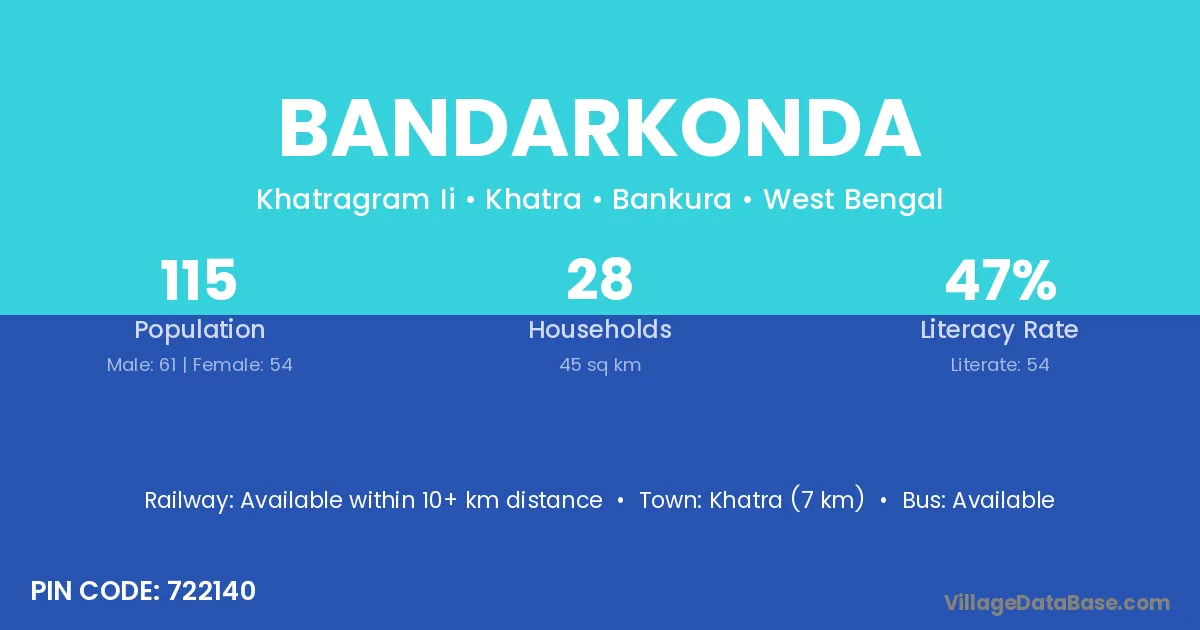 Khatra (7 km) is the nearest town to Bandarkonda village for major economic activities and is located approximately 7 km away.