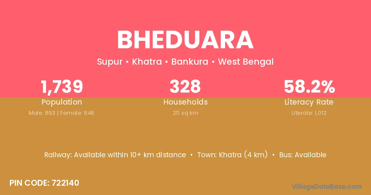 Khatra (4 km) is the nearest town to Bheduara village for major economic activities and is located approximately 4 km away.