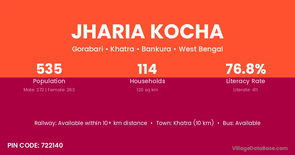 Khatra (10 km) is the nearest town to Jharia Kocha village for major economic activities and is located approximately 10 km away.