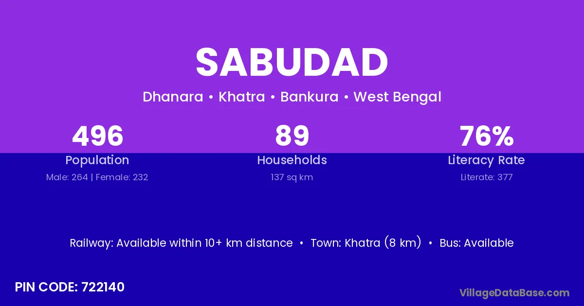 Khatra (8 km) is the nearest town to Sabudad village for major economic activities and is located approximately 8 km away.