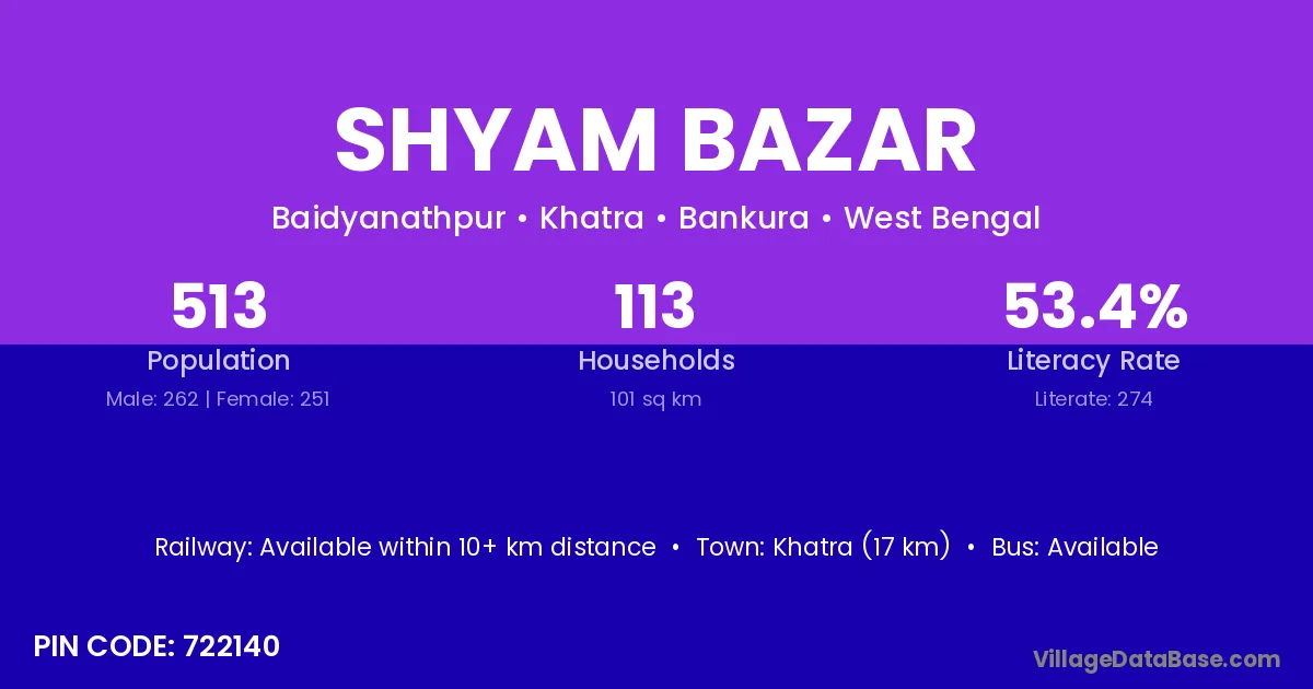 Khatra (17 km) is the nearest town to Shyam Bazar village for major economic activities and is located approximately 17 km away.