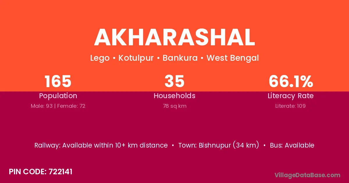 Bishnupur (34 km) is the nearest town to Akharashal village for major economic activities and is located approximately 34 km away.