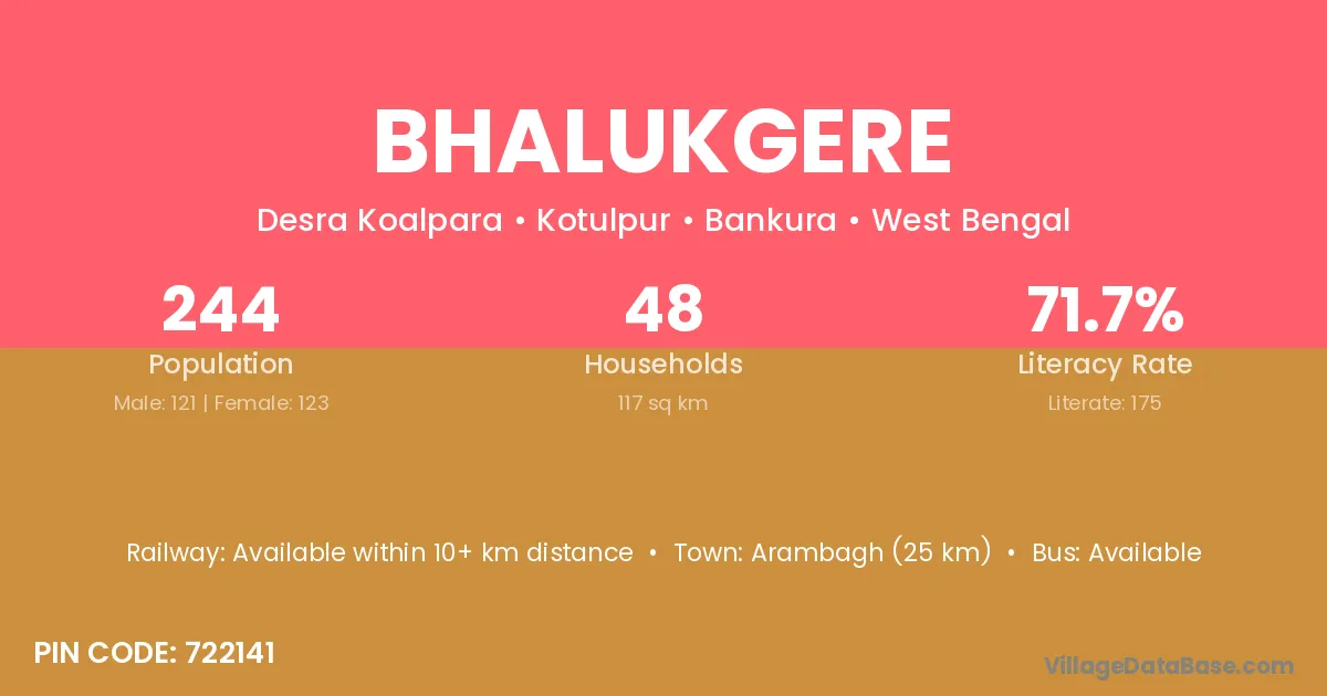 Arambagh (25 km) is the nearest town to Bhalukgere village for major economic activities and is located approximately 25 km away.