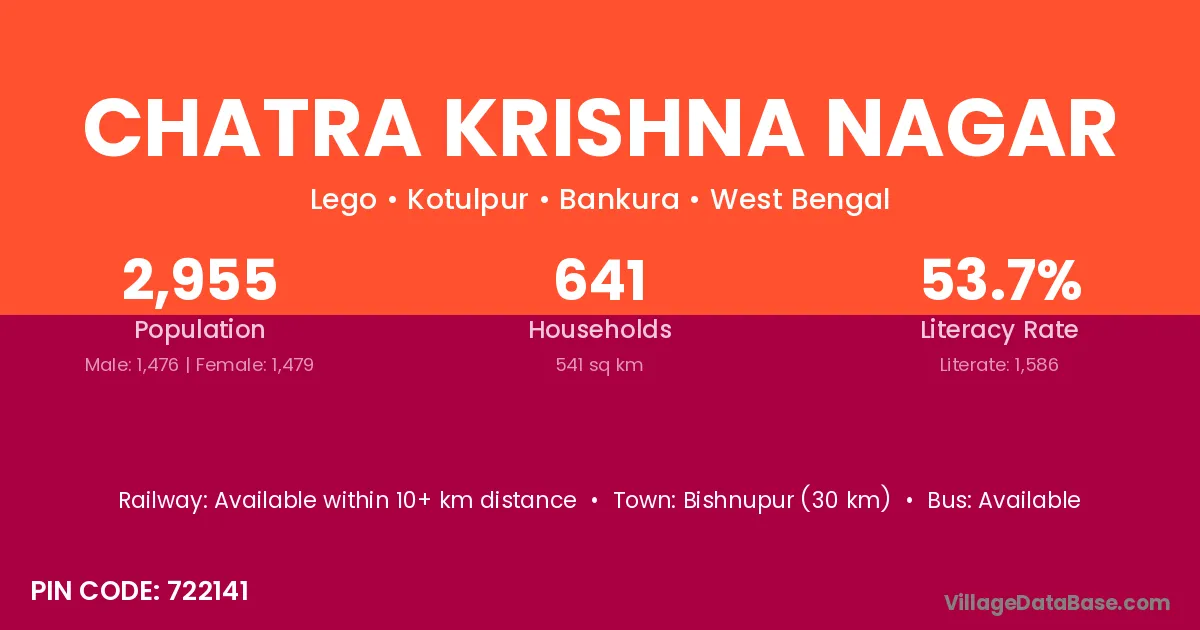 Bishnupur (30 km) is the nearest town to Chatra Krishna Nagar village for major economic activities and is located approximately 30 km away.