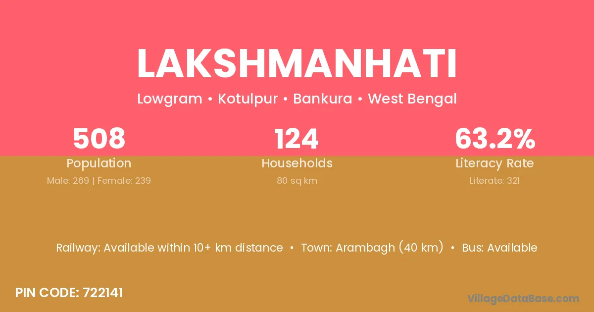 Arambagh (40 km) is the nearest town to Lakshmanhati village for major economic activities and is located approximately 40 km away.