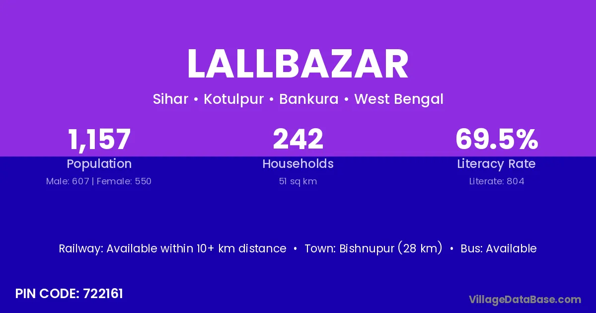 Bishnupur (28 km) is the nearest town to Lallbazar village for major economic activities and is located approximately 28 km away.