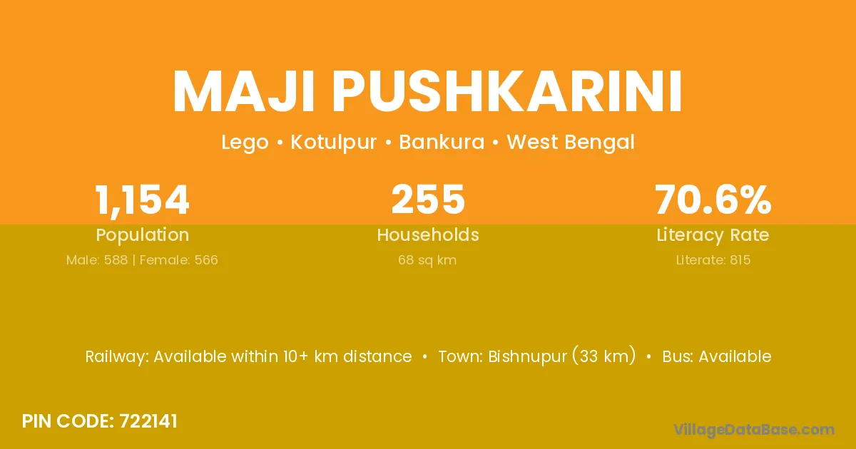 Bishnupur (33 km) is the nearest town to Maji Pushkarini village for major economic activities and is located approximately 33 km away.