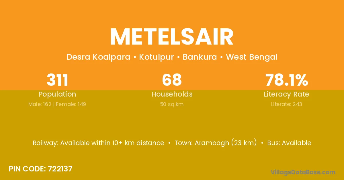 Arambagh (23 km) is the nearest town to Metelsair village for major economic activities and is located approximately 23 km away.