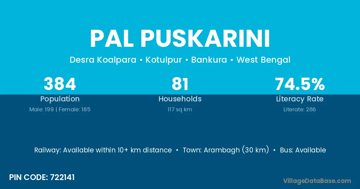 Arambagh (30 km) is the nearest town to Pal Puskarini village for major economic activities and is located approximately 30 km away.