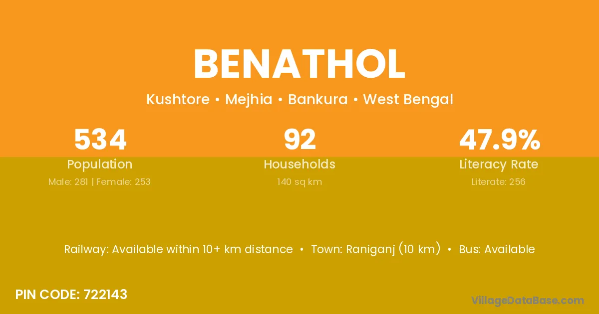 Raniganj (10 km) is the nearest town to Benathol village for major economic activities and is located approximately 10 km away.