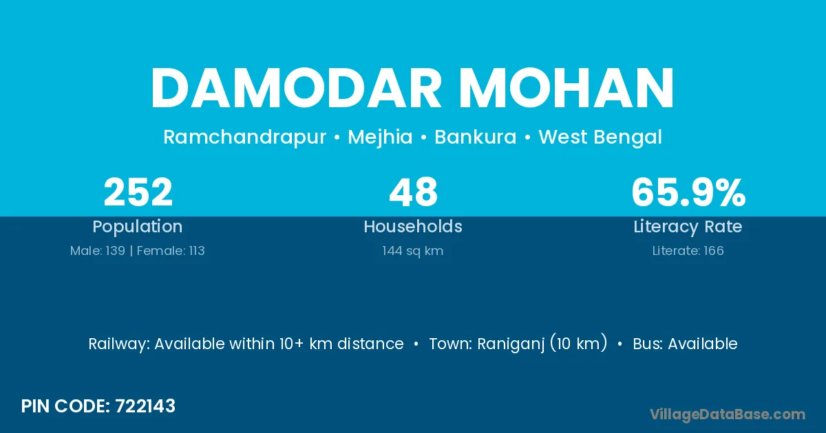 Raniganj (10 km) is the nearest town to Damodar Mohan village for major economic activities and is located approximately 10 km away.