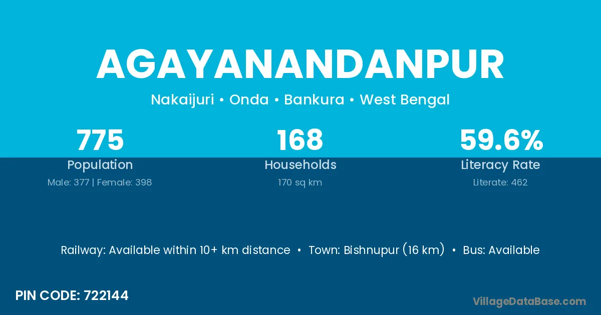 Bishnupur (16 km) is the nearest town to Agayanandanpur village for major economic activities and is located approximately 16 km away.