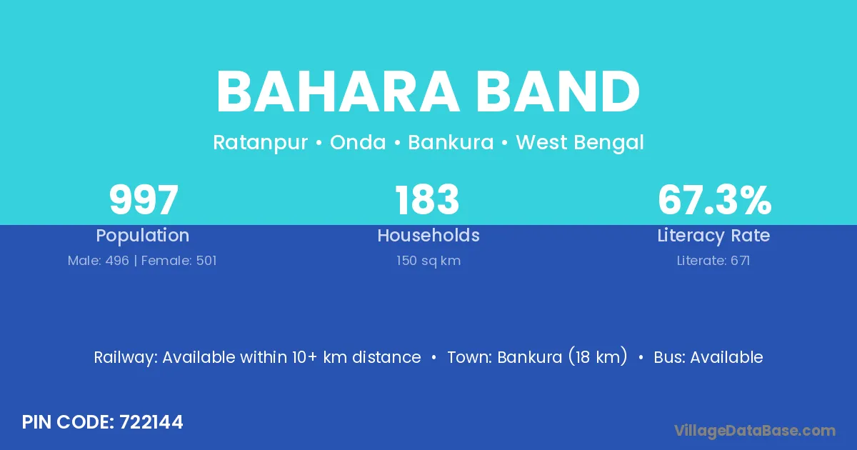 Bankura (18 km) is the nearest town to Bahara Band village for major economic activities and is located approximately 18 km away.