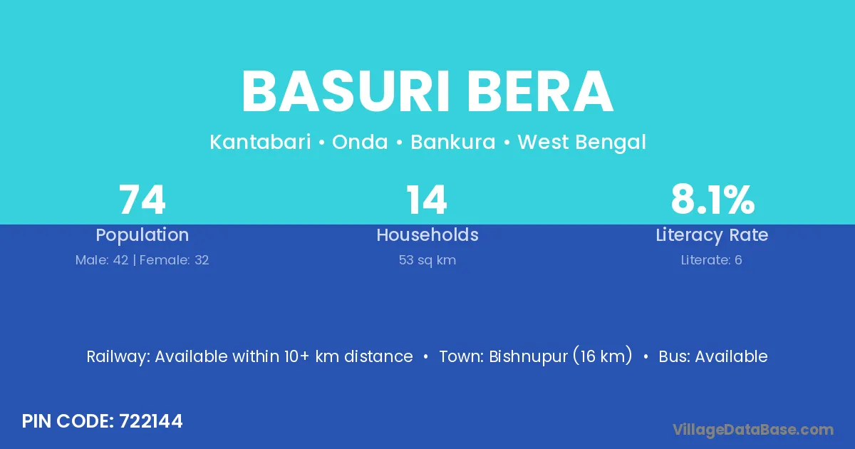 Bishnupur (16 km) is the nearest town to Basuri Bera village for major economic activities and is located approximately 16 km away.