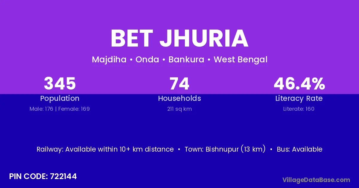 Bishnupur (13 km) is the nearest town to Bet Jhuria village for major economic activities and is located approximately 13 km away.