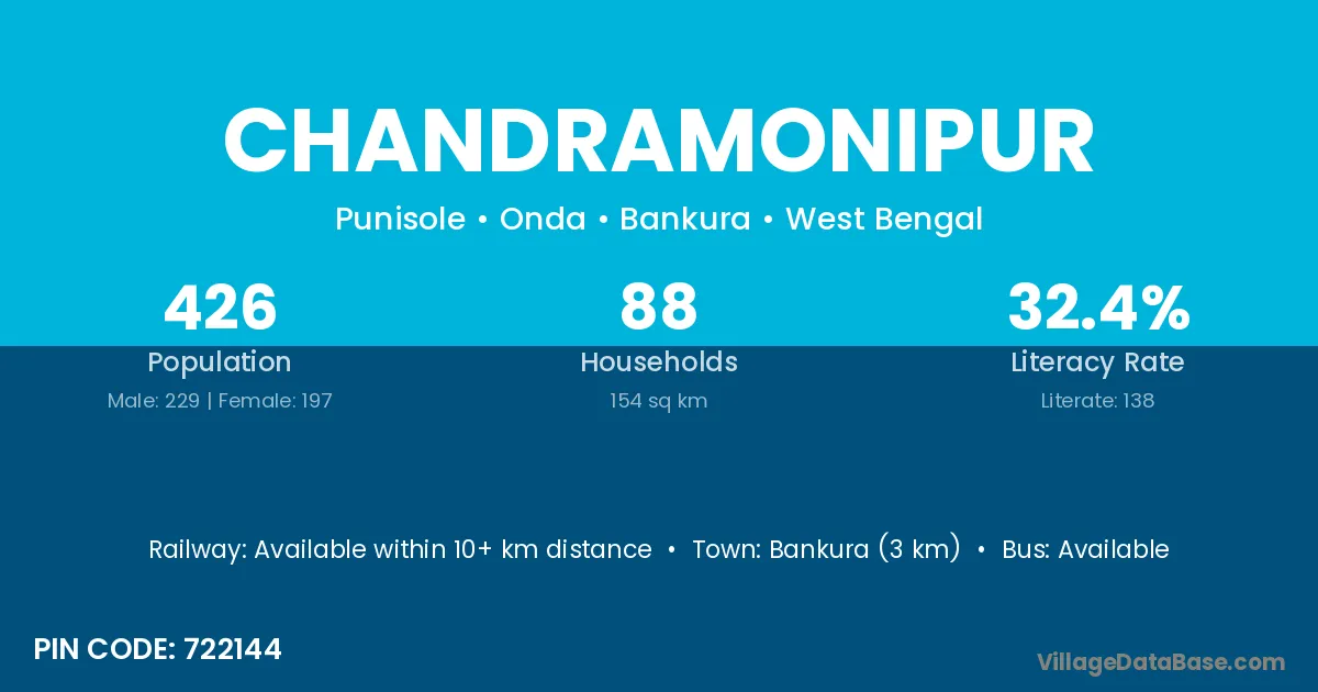 Bankura (3 km) is the nearest town to Chandramonipur village for major economic activities and is located approximately 3 km away.