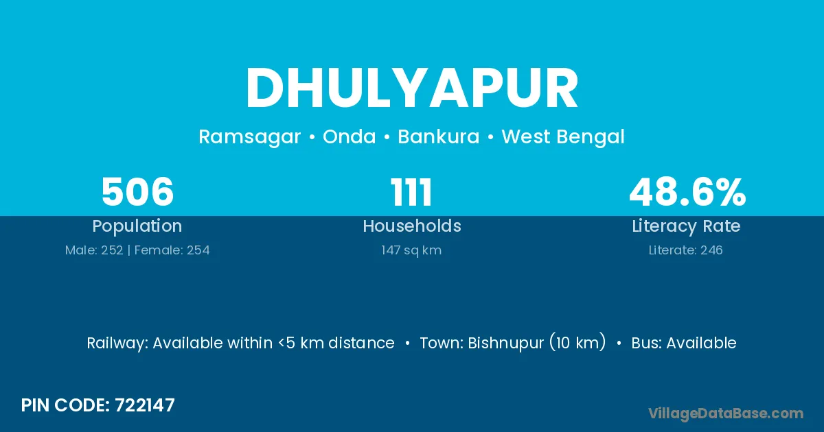Bishnupur (10 km) is the nearest town to Dhulyapur village for major economic activities and is located approximately 10 km away.