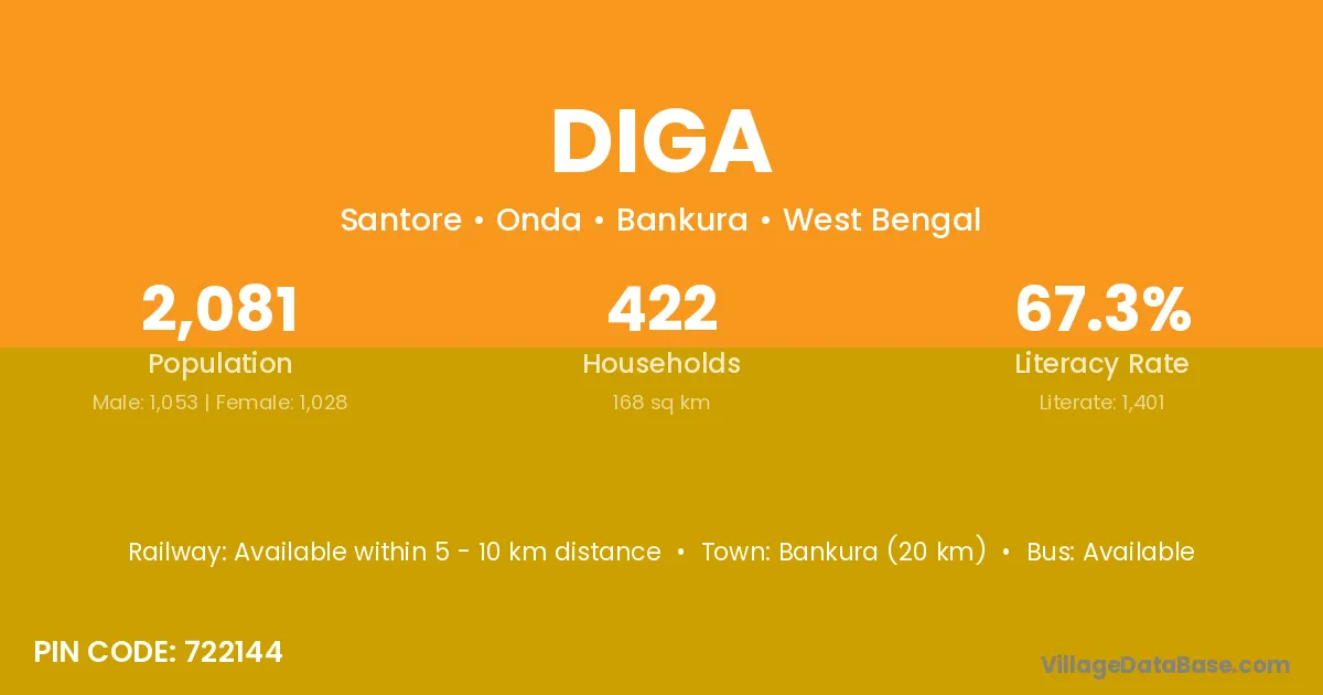 Bankura (20 km) is the nearest town to Diga village for major economic activities and is located approximately 20 km away.