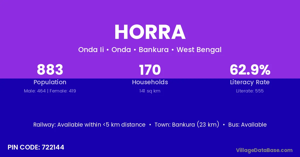 Bankura (23 km) is the nearest town to Horra village for major economic activities and is located approximately 23 km away.