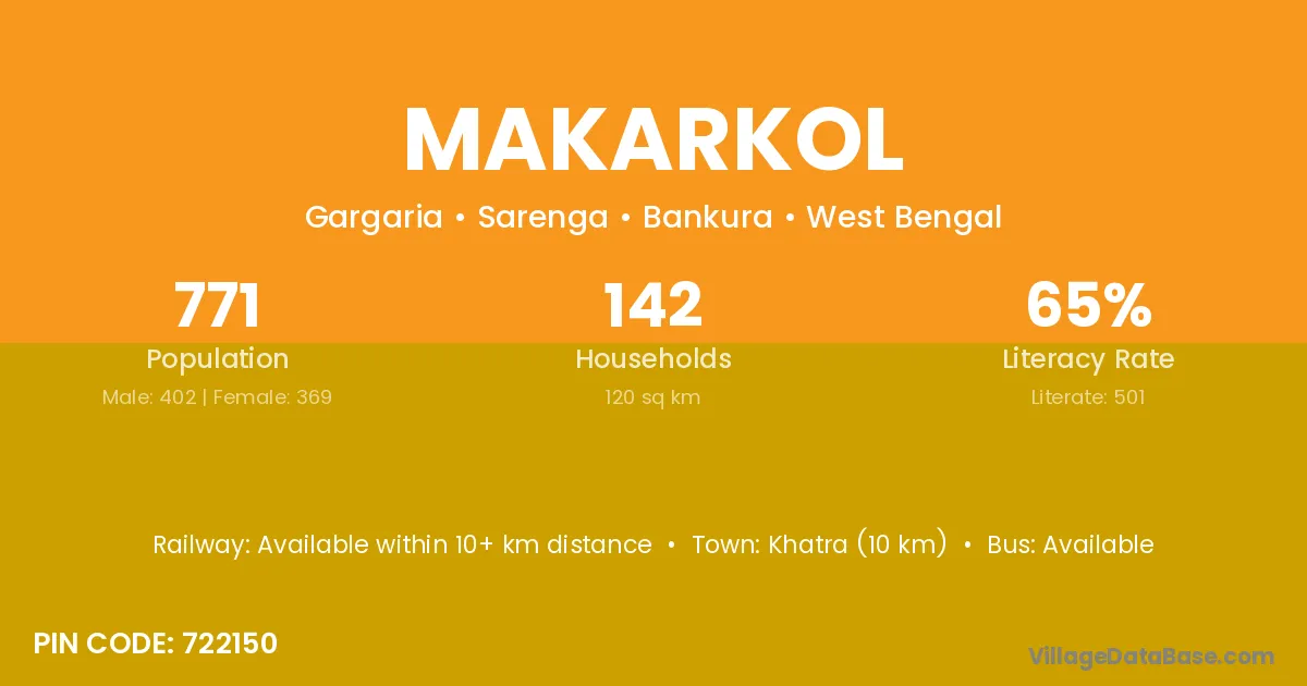 Bankura (23 km) is the nearest town to Makarkol village for major economic activities and is located approximately 23 km away.