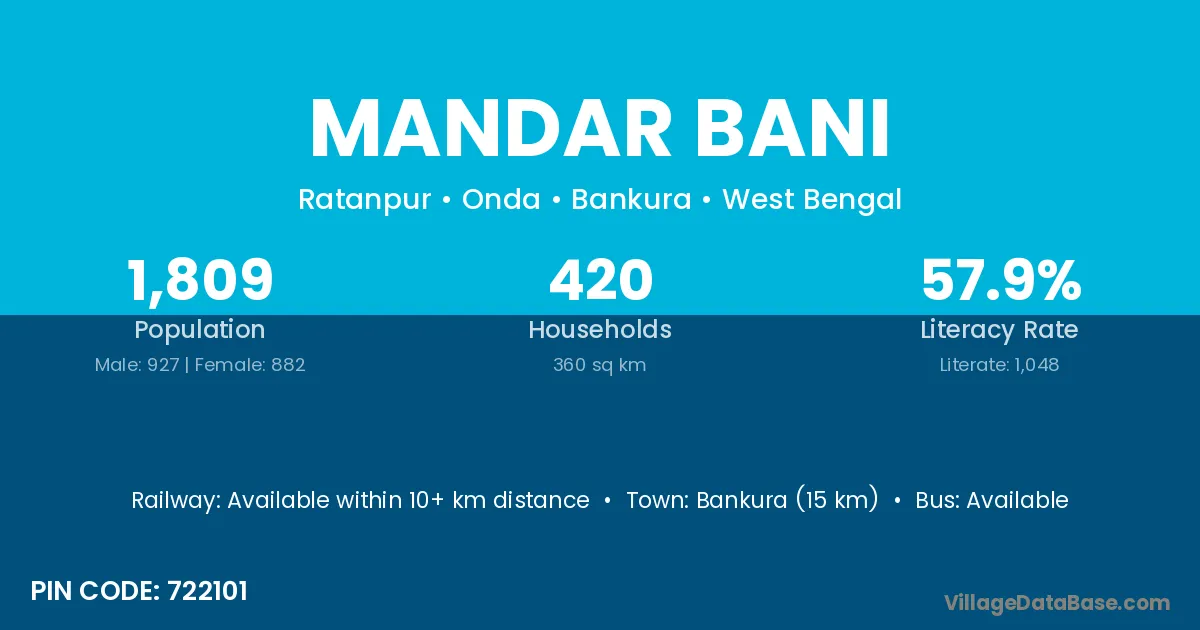 Bankura (15 km) is the nearest town to Mandar Bani village for major economic activities and is located approximately 15 km away.