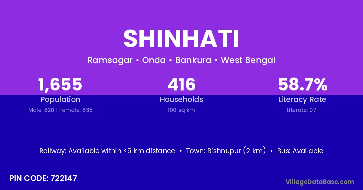 Bishnupur (2 km) is the nearest town to Shinhati village for major economic activities and is located approximately 2 km away.
