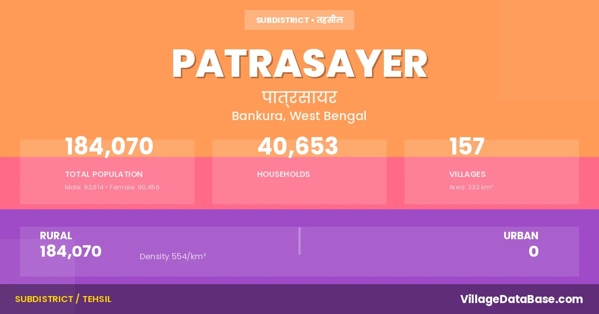 According to the 2011 census The total area of Patrasayer Subdivision is 333 km², with a population of 184070 people. The population density is 554 inhabitants per square kilometre, and there are approximately 40653 houses in the sub district.