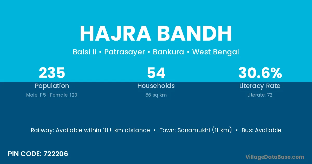 Sonamukhi (11 km) is the nearest town to Hajra Bandh village for major economic activities and is located approximately 11 km away.