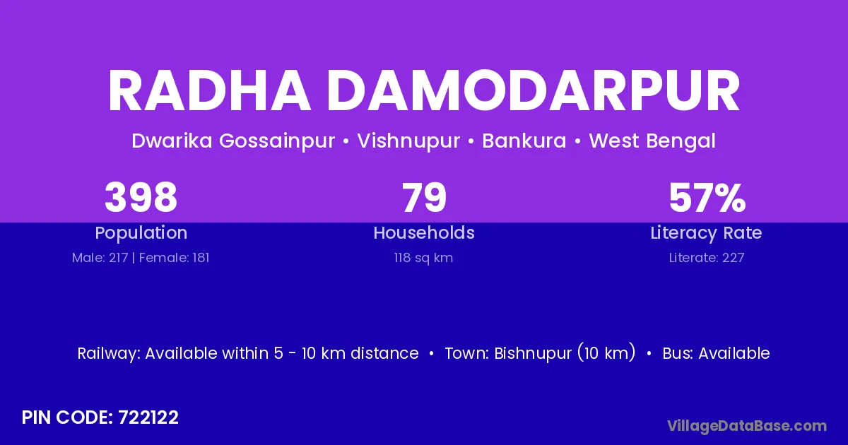 Patrasayer (10 km) is the nearest town to Radha Damodarpur village for major economic activities and is located approximately 10 km away.