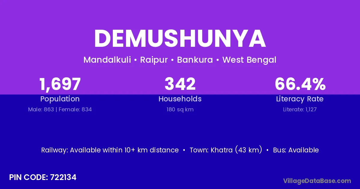 Khatra (43 km) is the nearest town to Demushunya village for major economic activities and is located approximately 43 km away.