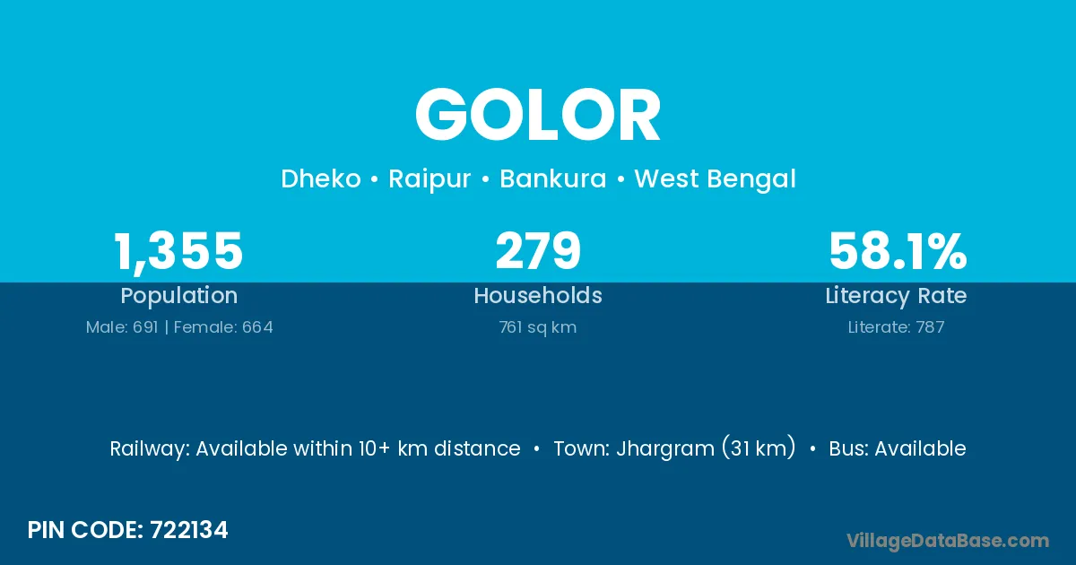 Jhargram (31 km) is the nearest town to Golor village for major economic activities and is located approximately 31 km away.