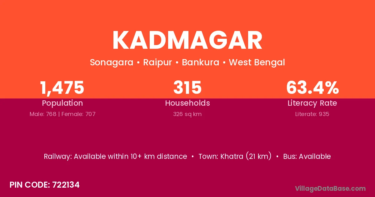 Khatra (21 km) is the nearest town to Kadmagar village for major economic activities and is located approximately 21 km away.