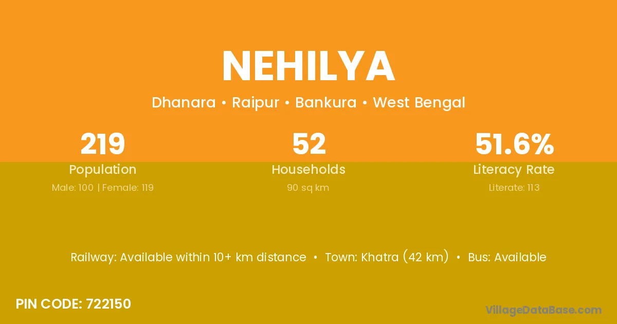 Khatra (42 km) is the nearest town to Nehilya village for major economic activities and is located approximately 42 km away.