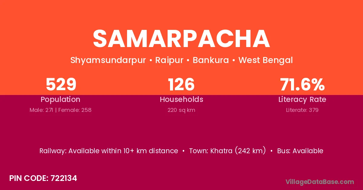 Khatra (242 km) is the nearest town to Samarpacha village for major economic activities and is located approximately 242 km away.