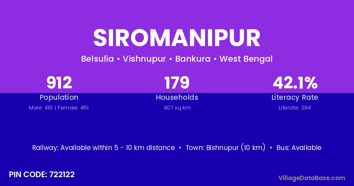 Khatra (36 km) is the nearest town to Siromanipur village for major economic activities and is located approximately 36 km away.