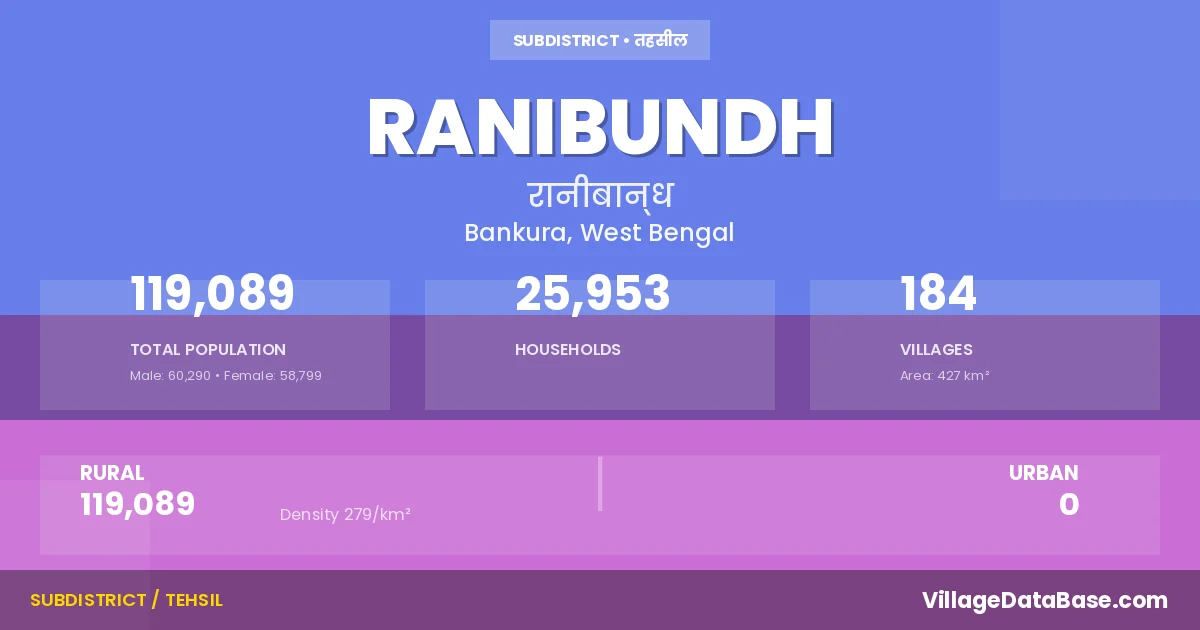 According to the 2011 census The total area of Ranibundh Subdivision is 427 km², with a population of 119089 people. The population density is 279 inhabitants per square kilometre, and there are approximately 25953 houses in the sub district.