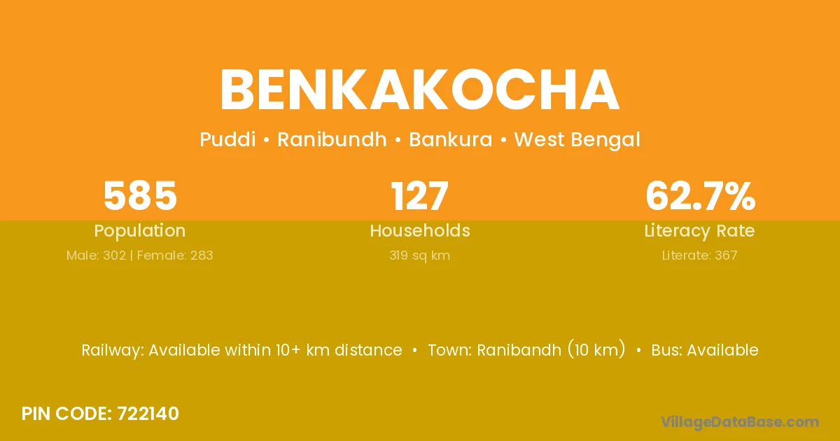 Ranibandh (10 km) is the nearest town to Benkakocha village for major economic activities and is located approximately 10 km away.