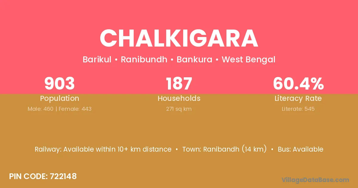 Chalkigara village has a total population of 903 people, of which 460 are males and 443 are females.