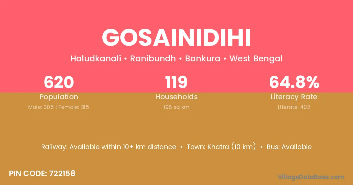Khatra (10 km) is the nearest town to Gosainidihi village for major economic activities and is located approximately 10 km away.