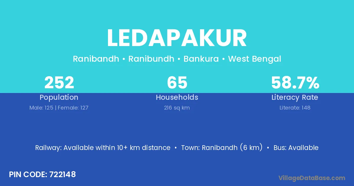 Ranibandh (6 km) is the nearest town to Ledapakur village for major economic activities and is located approximately 6 km away.