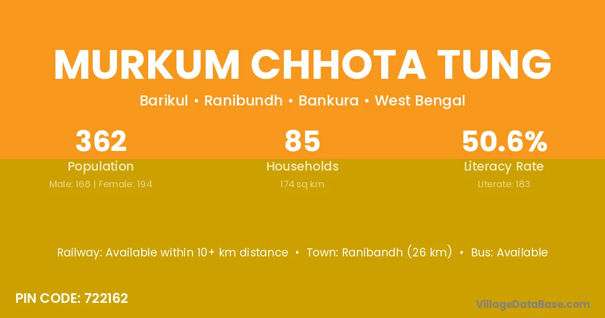 Murkum Chhota Tung village has a total population of 362 people, of which 168 are males and 194 are females.
