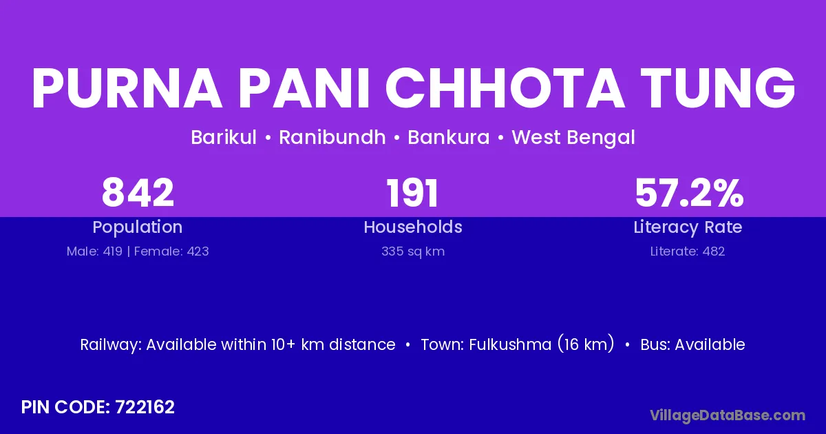Purna Pani Chhota Tung village has a total population of 842 people, of which 419 are males and 423 are females.