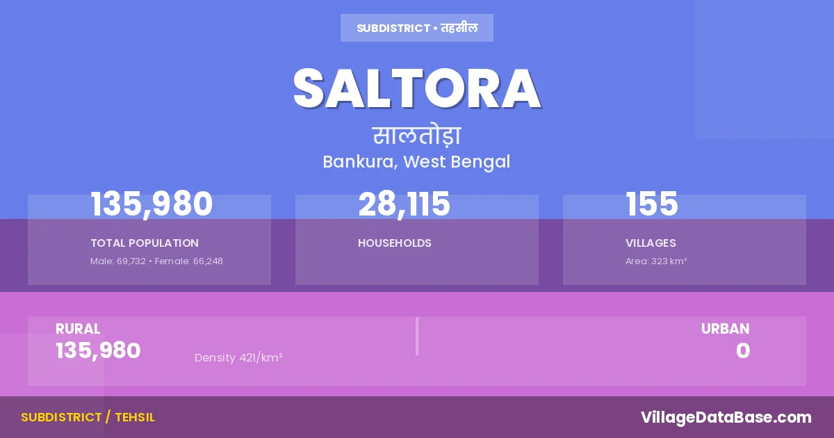 According to the 2011 census The total area of Saltora Subdivision is 323 km², with a population of 135980 people. The population density is 421 inhabitants per square kilometre, and there are approximately 28115 houses in the sub district.