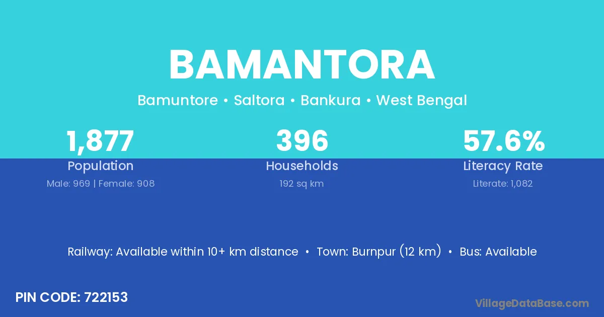 Burnpur (12 km) is the nearest town to Bamantora village for major economic activities and is located approximately 12 km away.